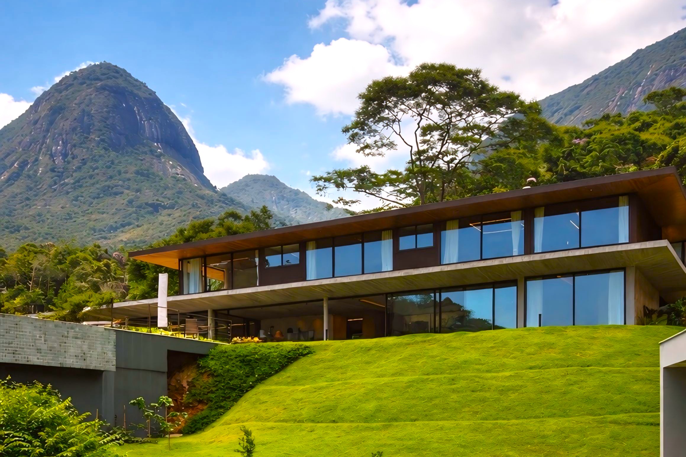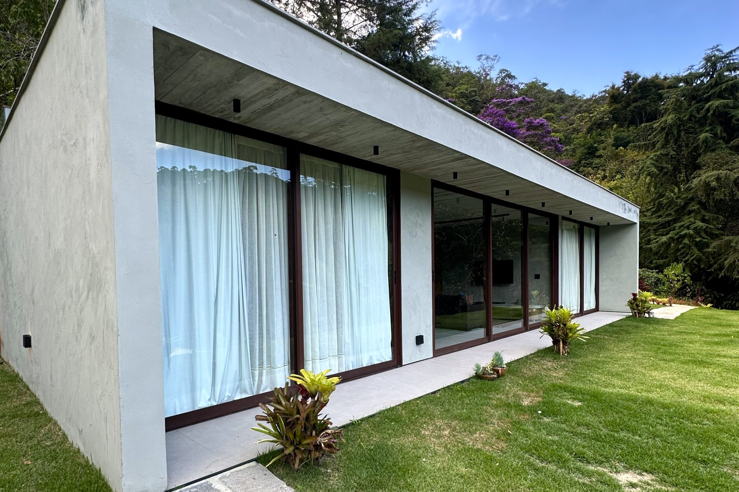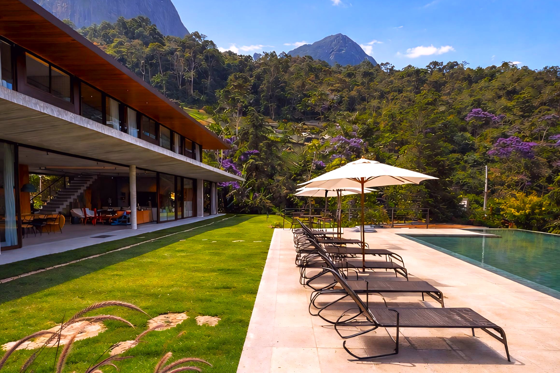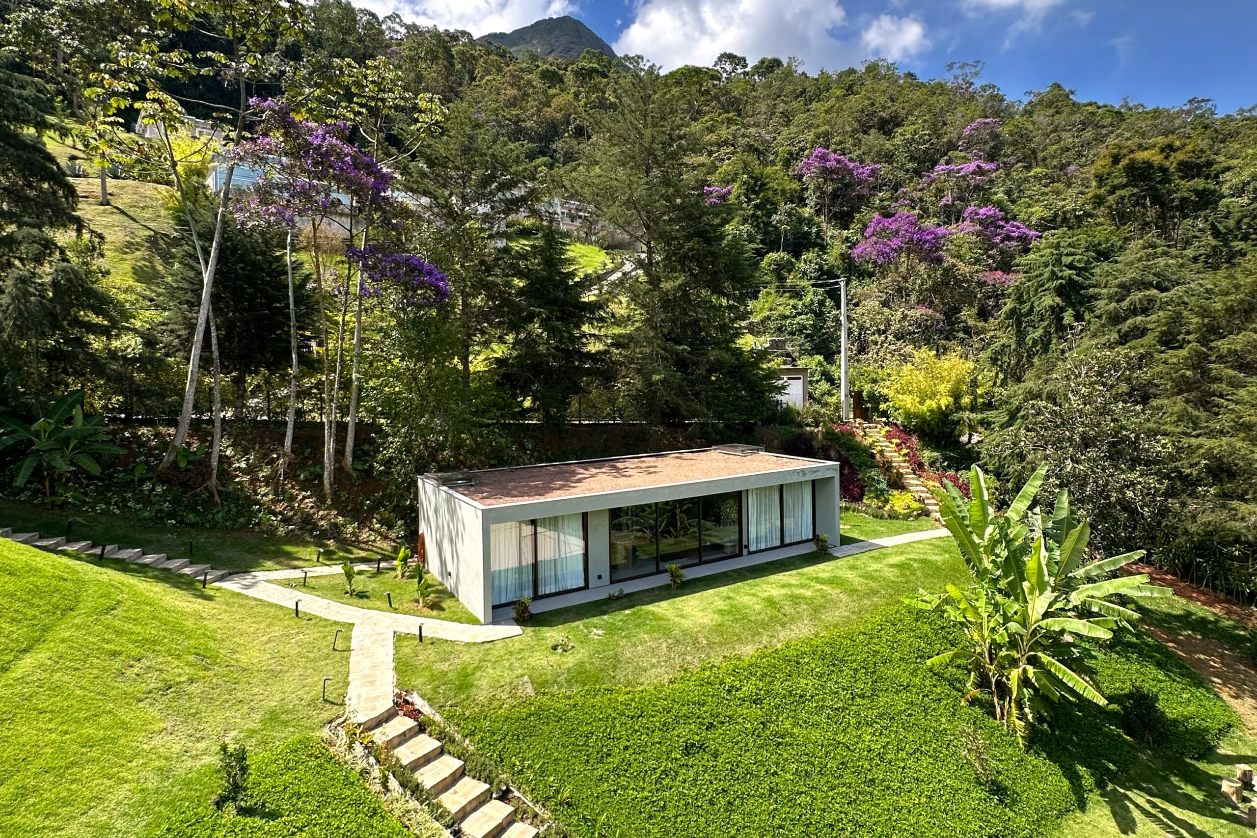 This contemporary 900 sqm residence, situated on a 7,000 sqm plot in the heart of the Atlantic Forest (Rock Valley Condominium), offers complete harmony with nature and a full range of amenities including 7 suites. The two-story main house features 4 suites on the upper floor, all with private balconies integrated into the main balcony. The ground floor offers ample parking, an office, a powder room, a living room with a fireplace, a climate-controlled wine cellar, and a spacious 75 m² gourmet area. The leisure area includes a dry sauna, a gym, a cinema room, and a heated infinity pool with a shallow end, as well as an equipped kitchen and service quarters. There is also an independent guest house with 2 suites, a living room, and a kitchen. The property features a sand court for beach tennis, fiber optic and Starlink internet with redundancy, a 70 kVA automatic generator, a photovoltaic system with an average generation of 2,800 kWh/month, and a hybrid water heating system. Inverter air conditioning is available in all bedrooms.