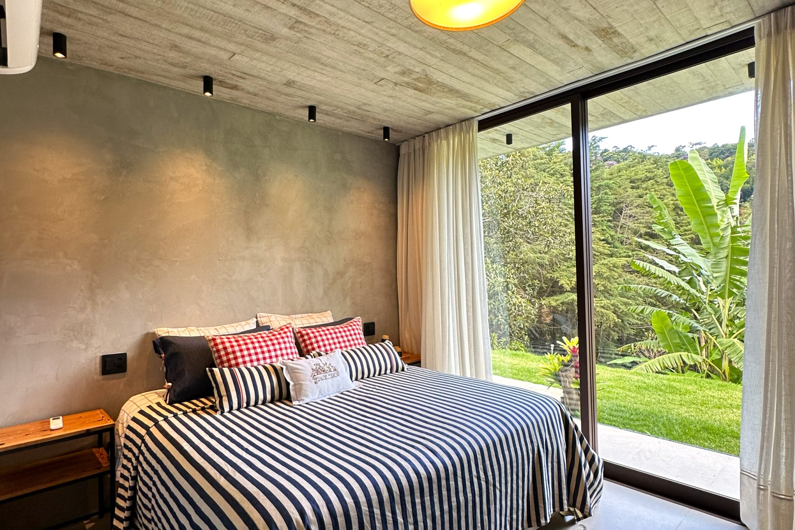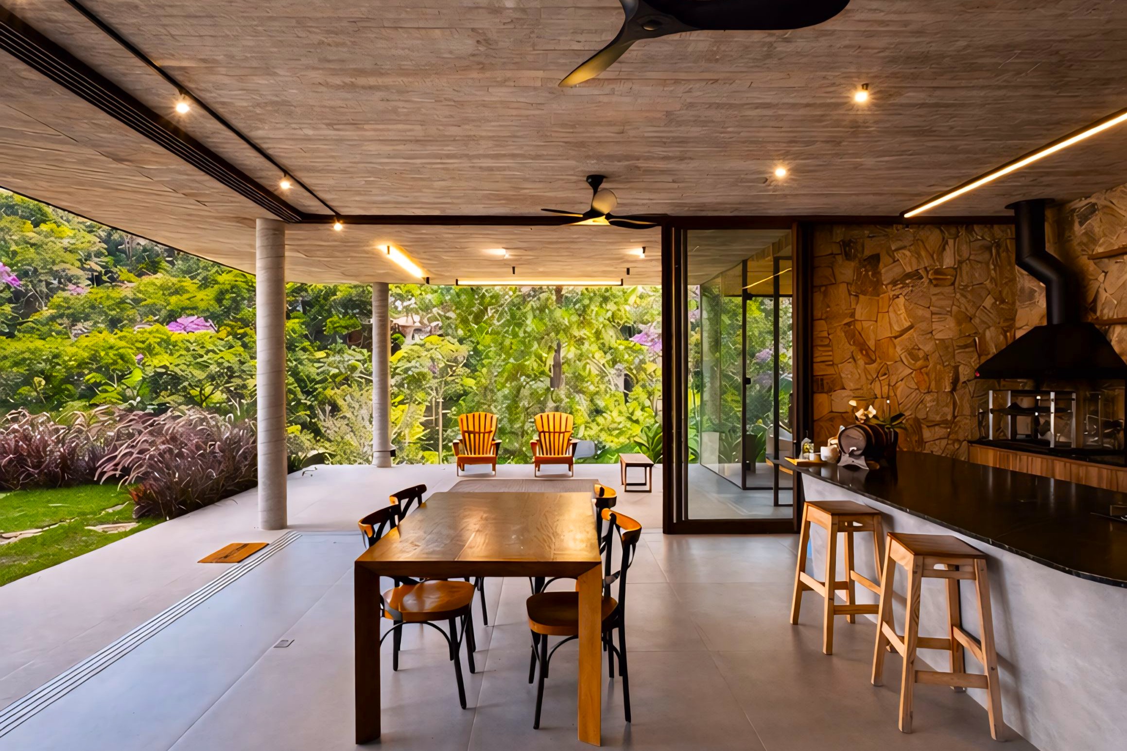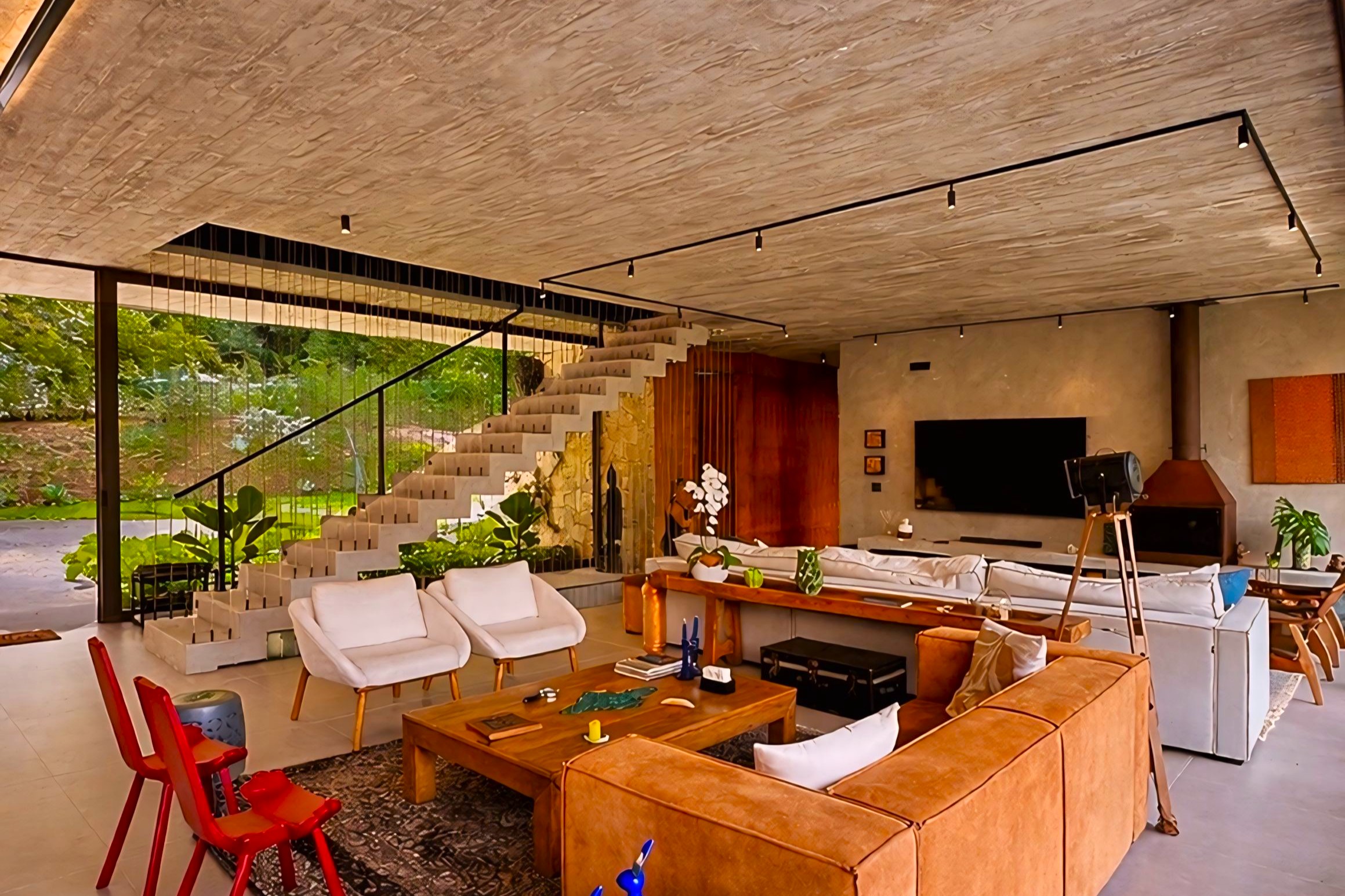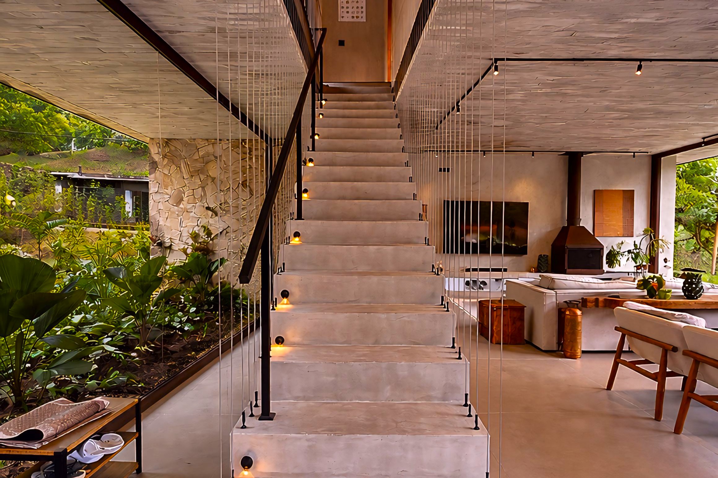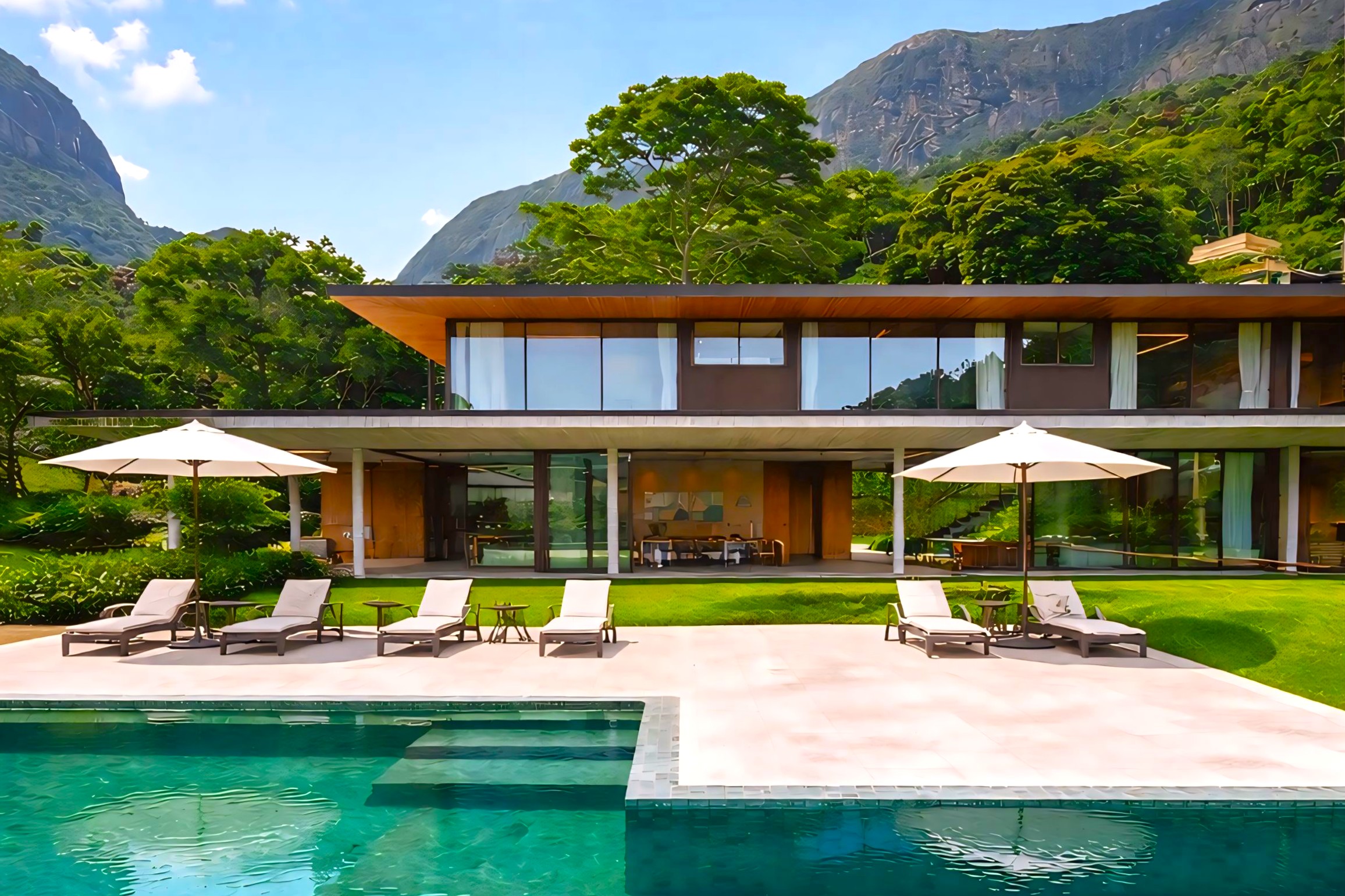 This contemporary 900 sqm residence, situated on a 7,000 sqm plot in the heart of the Atlantic Forest (Rock Valley Condominium), offers complete harmony with nature and a full range of amenities including 7 suites. The two-story main house features 4 suites on the upper floor, all with private balconies integrated into the main balcony. The ground floor offers ample parking, an office, a powder room, a living room with a fireplace, a climate-controlled wine cellar, and a spacious 75 m² gourmet area. The leisure area includes a dry sauna, a gym, a cinema room, and a heated infinity pool with a shallow end, as well as an equipped kitchen and service quarters. There is also an independent guest house with 2 suites, a living room, and a kitchen. The property features a sand court for beach tennis, fiber optic and Starlink internet with redundancy, a 70 kVA automatic generator, a photovoltaic system with an average generation of 2,800 kWh/month, and a hybrid water heating system. Inverter air conditioning is available in all bedrooms.