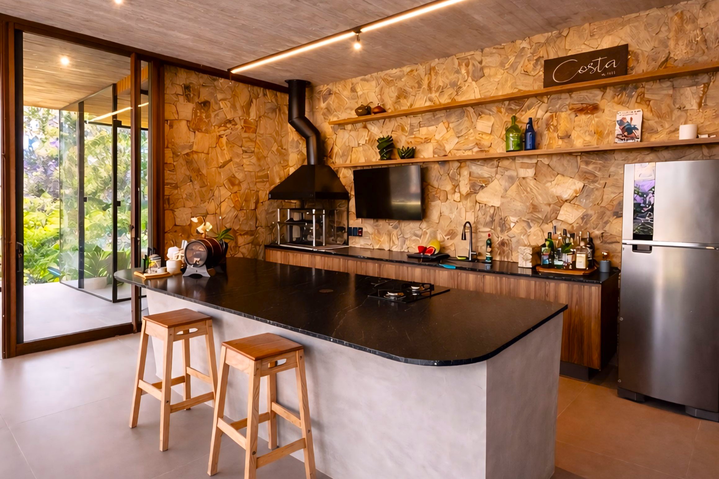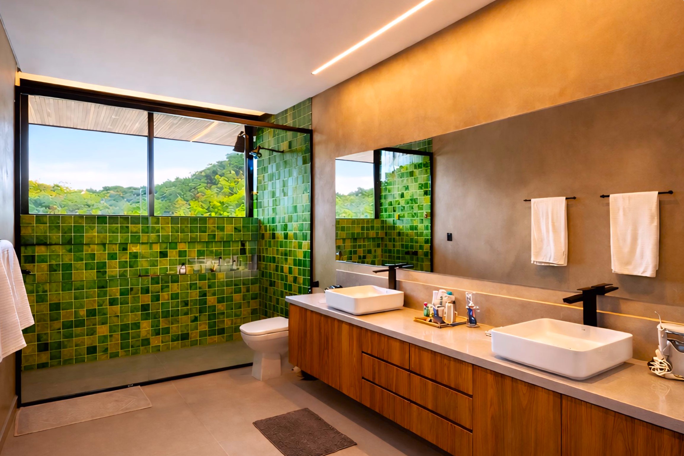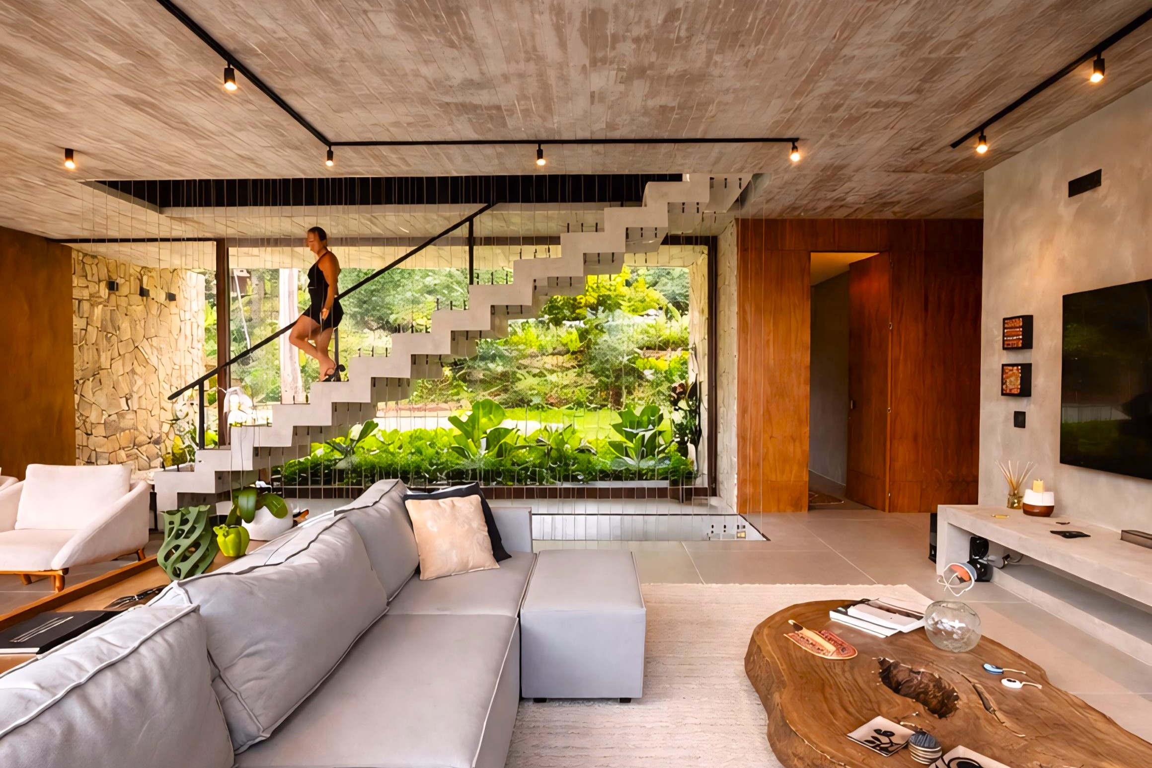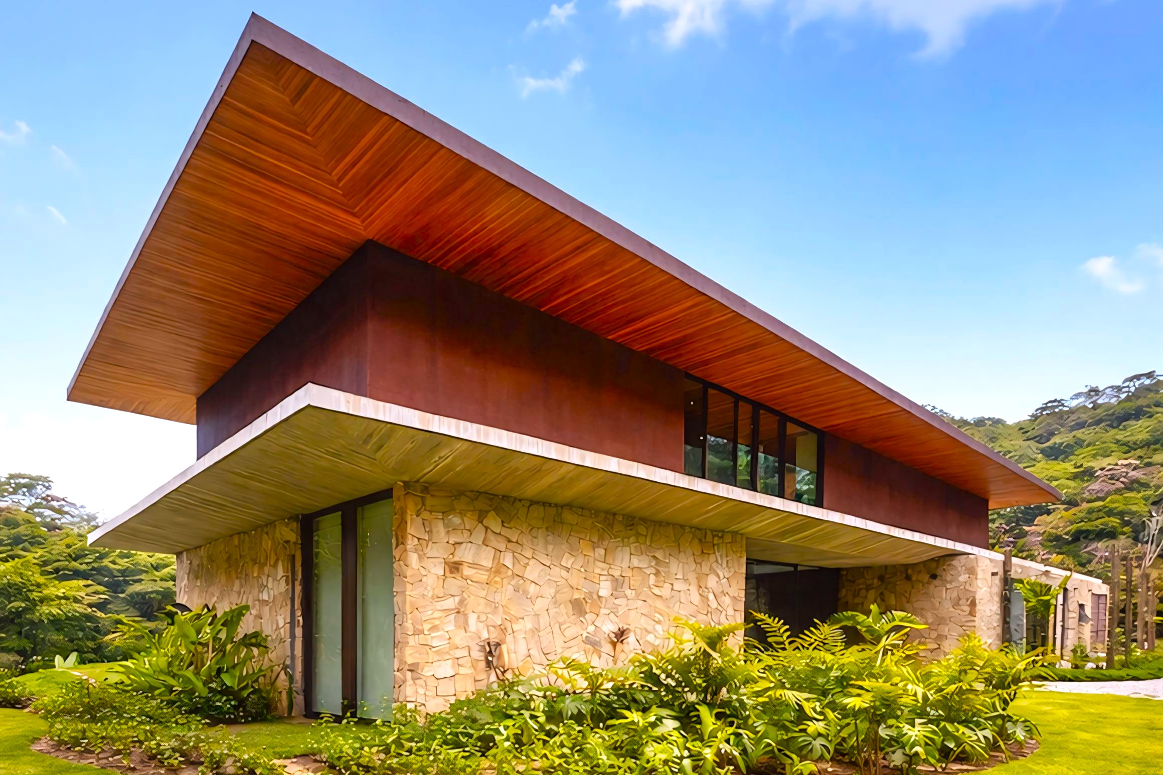 This contemporary 900 sqm residence, situated on a 7,000 sqm plot in the heart of the Atlantic Forest (Rock Valley Condominium), offers complete harmony with nature and a full range of amenities including 7 suites. The two-story main house features 4 suites on the upper floor, all with private balconies integrated into the main balcony. The ground floor offers ample parking, an office, a powder room, a living room with a fireplace, a climate-controlled wine cellar, and a spacious 75 m² gourmet area. The leisure area includes a dry sauna, a gym, a cinema room, and a heated infinity pool with a shallow end, as well as an equipped kitchen and service quarters. There is also an independent guest house with 2 suites, a living room, and a kitchen. The property features a sand court for beach tennis, fiber optic and Starlink internet with redundancy, a 70 kVA automatic generator, a photovoltaic system with an average generation of 2,800 kWh/month, and a hybrid water heating system. Inverter air conditioning is available in all bedrooms.