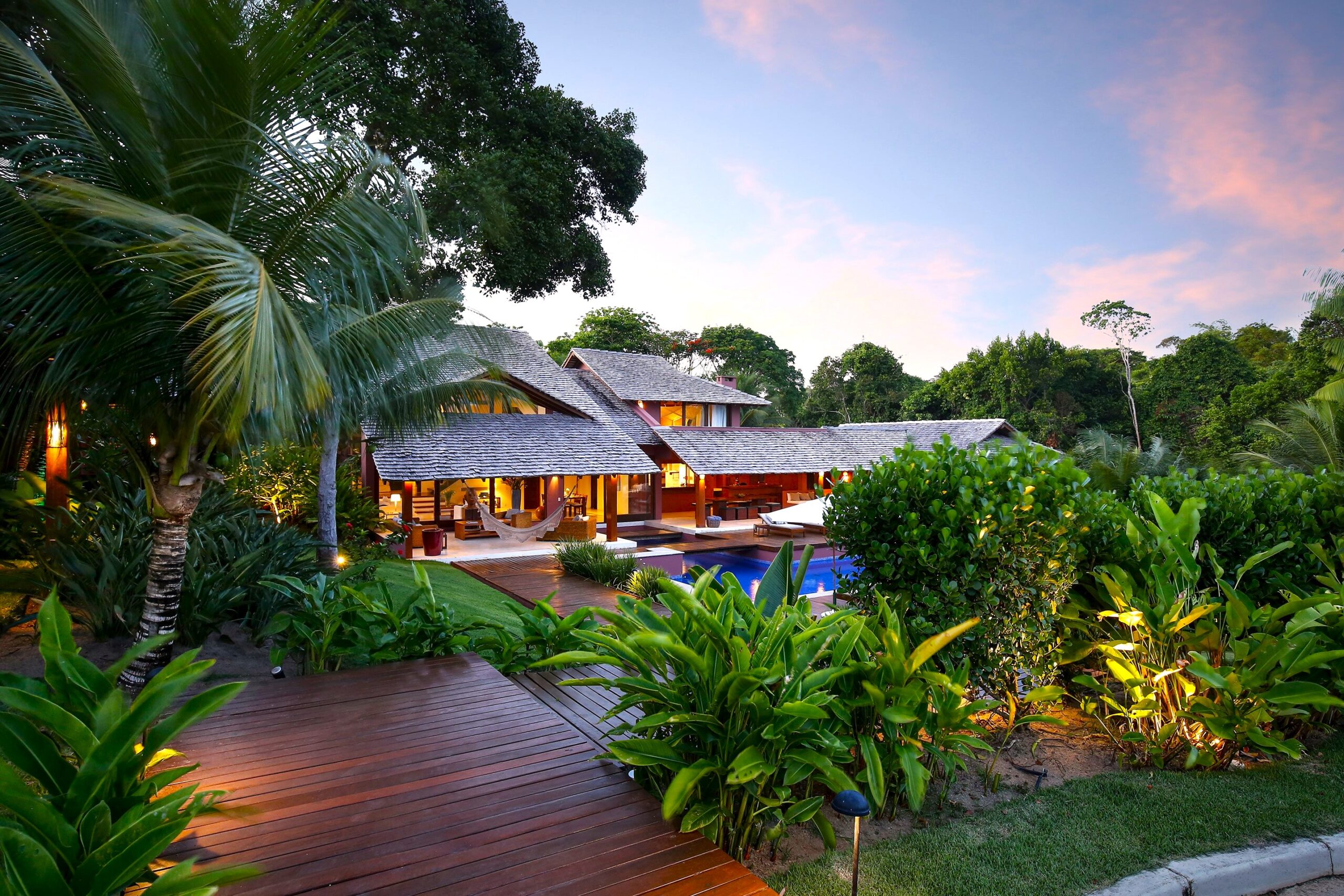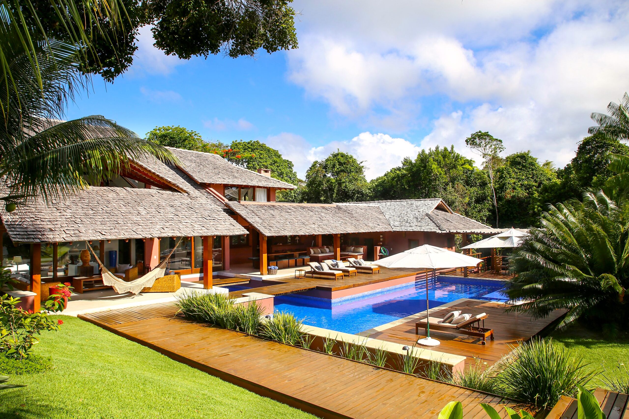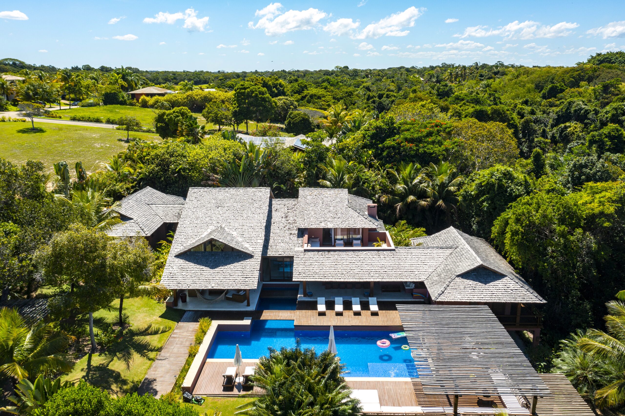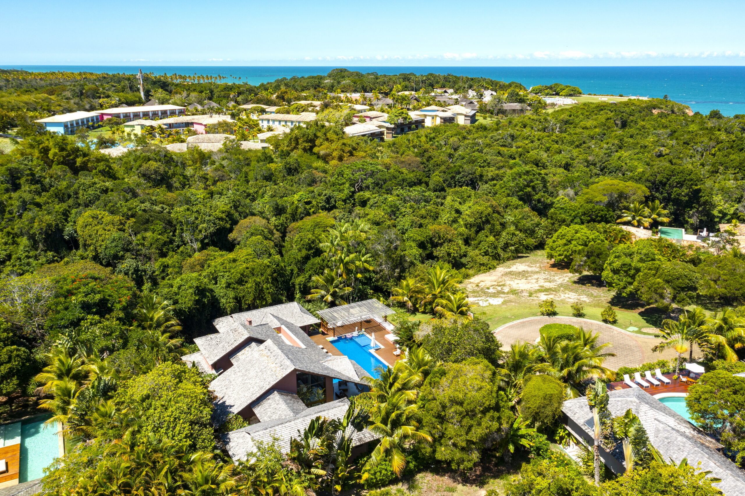 Located in the Terravista Golf condominium in Trancoso, this stunning 710 sqm house on a 2,095 sqm lot offers the perfect balance between sophistication and nature. The property borders the Atlantic Forest. The residence features six suites, including a master suite on the upper floor with open views, a walk-in closet, and a whirlpool tub. The leisure and living areas invite relaxation. The house features a beautiful swimming pool with a gazebo. The covered gourmet area seamlessly integrates with the pool. This is a unique opportunity to live in one of Bahia’s most desirable destinations.